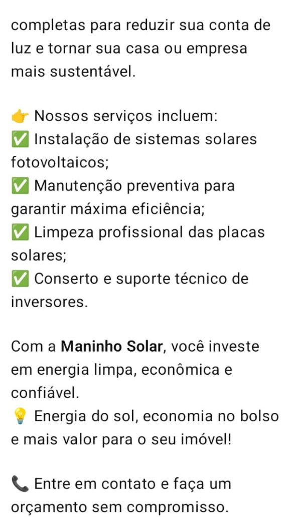 Como os serviços oferecidos pela empresa visam garantir a satisfação do cliente a Maninho Solar Energia Renovável está voltada para a busca constante da excelência no atendimento de seus clientes.